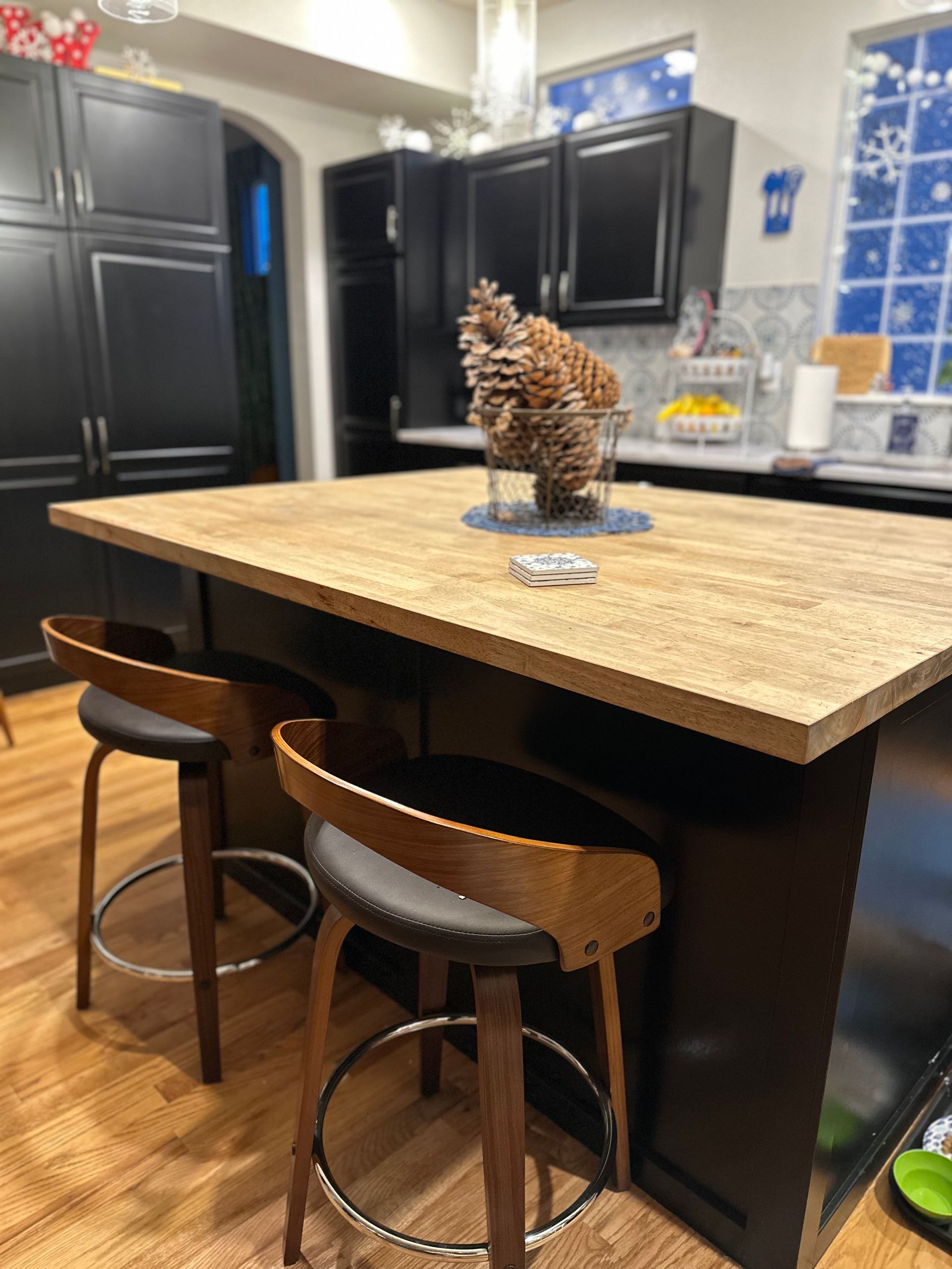 custom island with butcher block countertop, re-painted cabinets, new hardware, pantry, tile backsplash, and quartz countertops