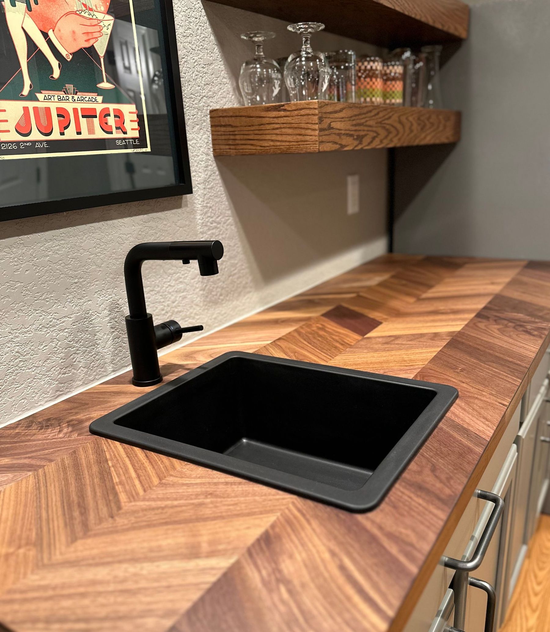 walnut chevron countertop with matte black bar sink and faucet, and new floating shelves