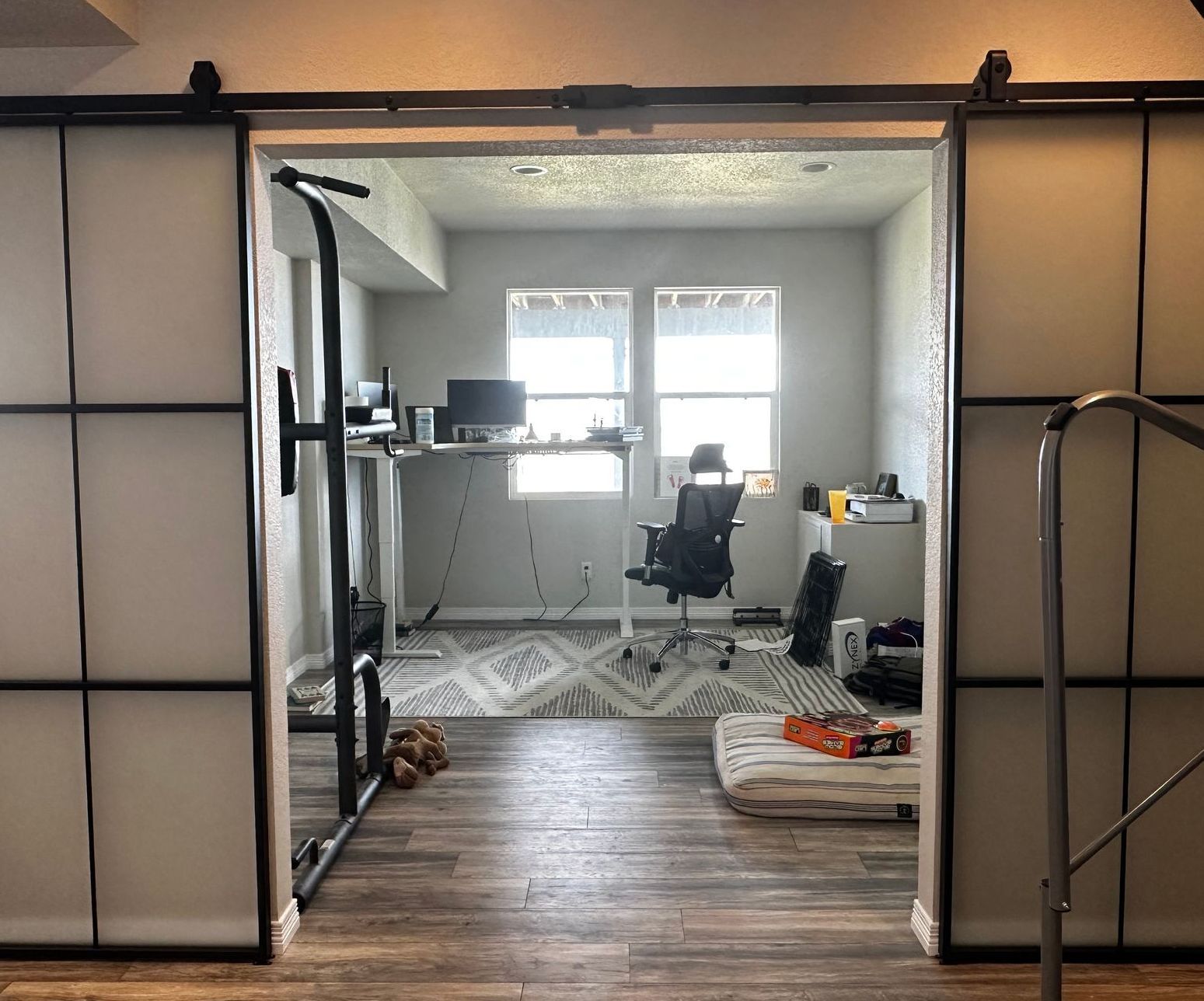 new office built into existing finished basement, with insullated walls, new electric wall heater, and frosted glass barn doors