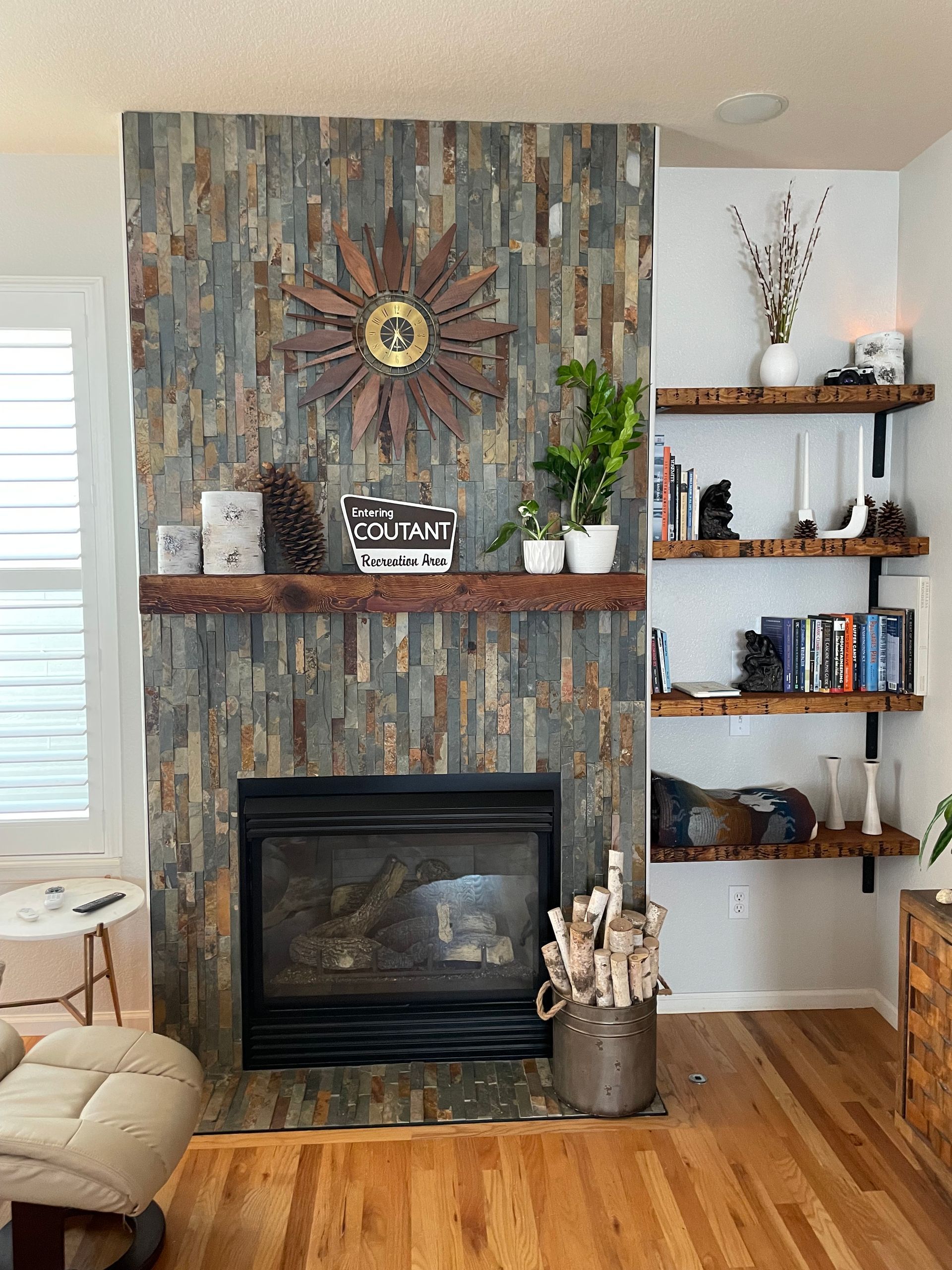 vertical ledger stone with reclaimed mantle and shelves